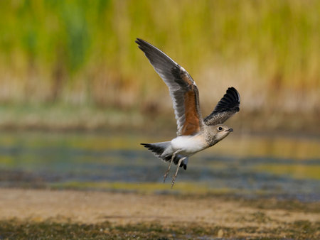 Collared pratincole, Glareola pratincola, single juvenile bird in flight, Spain, June 2022