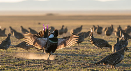 Northern Bobwhites gathered around a watering hole in a Texas prairie, their vibrant plumage reflecting in the clear water.
