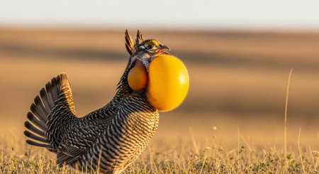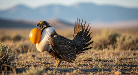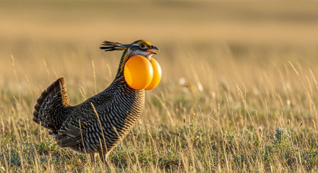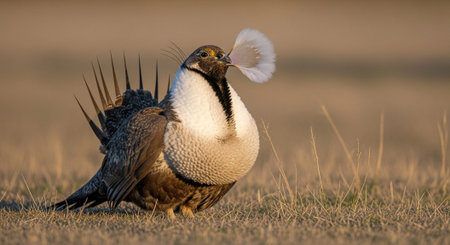 Great Bustard (Otis tarda). Large male bird balloon displaying in Open Grassland with Flowers in Extremadura Spain. March. Wildlife Scene of Nature in Europe.