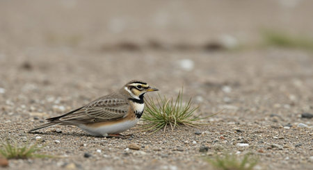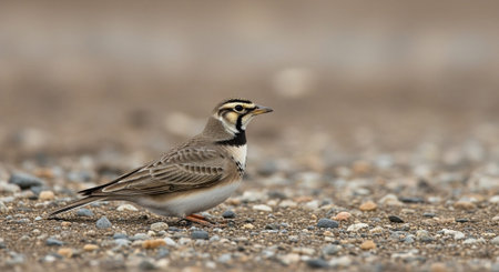 A small bird with brown and white feathers stands on smooth pebbles along a lakeshore or seaside, with distant mountains and calm water under a clear sky, capturing a peaceful natural scene perfect for nature or wildlife themes