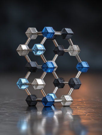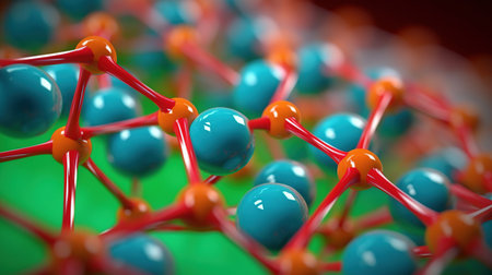 This abstract image captures the intricate beauty of a molecular structure with glass-like spheres, reflecting colorful shades in a modern design.