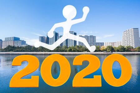 Happy New Year 2020 number on nature blue sky,green grass and sunset light,holiday nature concept