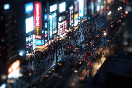 A busy city street with many people and cars. The street is lit up with neon signs and the people are walking around. Scene is lively and bustling