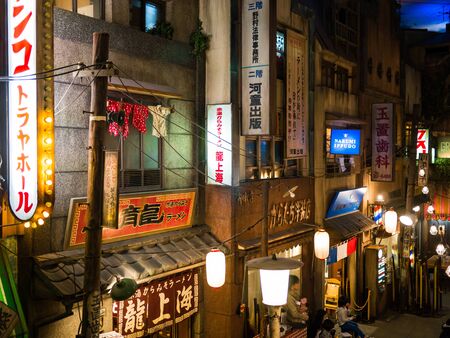 TOKYO, JAPAN - APR 14, 2019 : Restaurant Bar street shop sign Japan Izakaya Night life