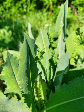 a green grasshopper sitting on young green leaves, grass. View of the insect from behind. Mimicry in nature. Natural botanical background.