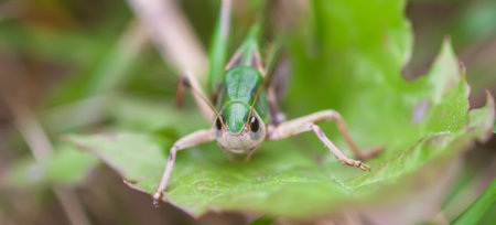 Green grasshopper sitting on leaf. Small Tettigonia viridissima with long antennae sit in grass, side view. Nymph of great green bush-cricket, soft selective focus