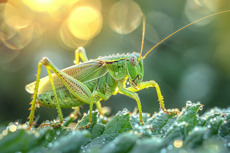 Close-up of a grasshopper on dew-covered grass in the morning light