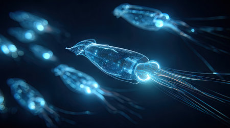 This stunning image features glowing squid in a dark ocean setting, enhanced by digital effects, highlighting the beauty and mystery of marine life.
