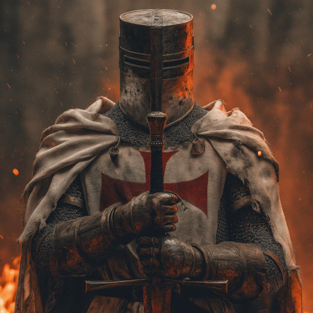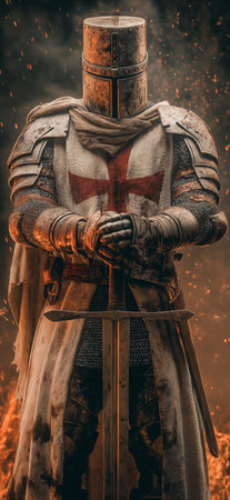A valiant knight, clad in chainmail and armor, holds a sword and a shield featuring a red cross, embodying the spirit of medieval chivalry and valor.