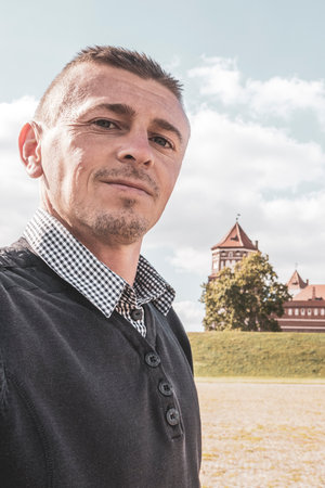 Man handsome male tourist at the Mir Castle majestic fortification fortress park and monument with blue sky in Mir Karelichy District Hrodna Region Belarus.
