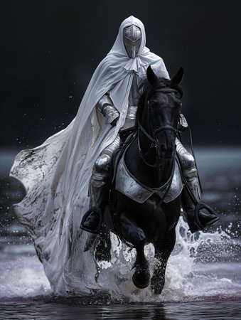 Knight in white armor on a black horse in the water. Medieval period.