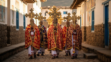 Ethiopian priests process with golden crosses, wearing ornate robes.