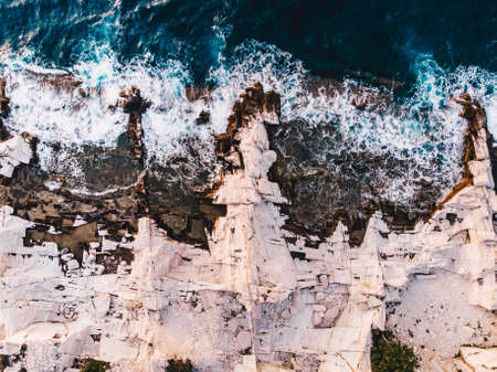 Top aerial view of turquoise Atlantic ocean water waves crashing on rocks on the Portuguese Madera island seashore.