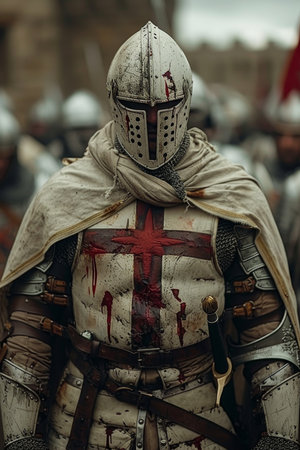 Crusader in white cross coat roams bloodied battlefield under cinematic HDR Generative AI Generated