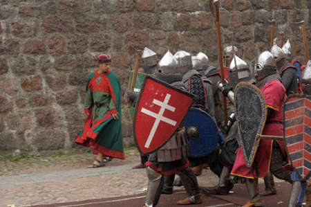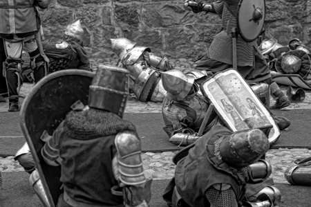 Fight between the pedestrian knights in a heavy armor in a medieval castle against a stone wall , Vyborg,Russia, july-31