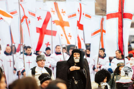 GEORGIA, TBILISI - JANUARY 7, 2016: Participants march during Alilo, a religious procession to celebrate Orthodox Christmas in center of Tbilisi, Georgia, Caucasus region.