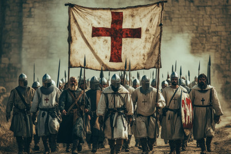 Crusaders marching under a cross banner a symbol of religious wars and the crusades