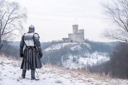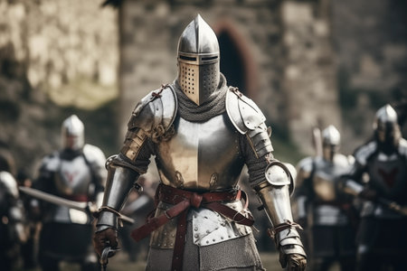 A brave and valiant knight, dressed in shining and polished armor, stands ready for an epic battle on a medieval field. Generative AI