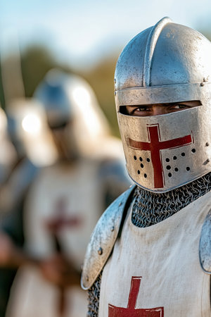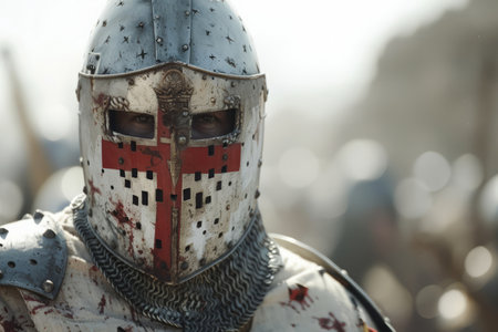 Medieval Knight in Armor with Helmet and Sword in Historical Battle Scene.