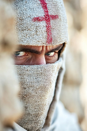 A cloaked figure, symbolizing the Knights Templar, gazes intently while blending into ancient surroundings.