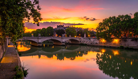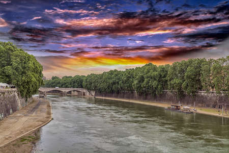 Romantic showing rome tiber river bridge and buildings at sunset with fiery orange sky keywords: rome, tiber,...