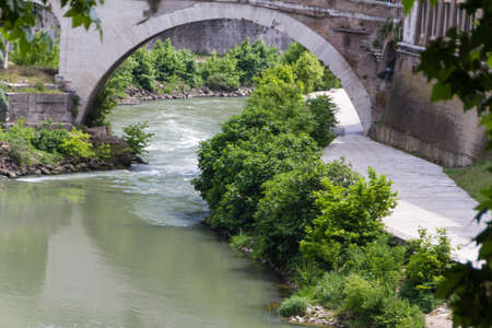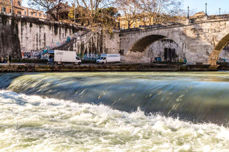 ROME, ITALY - JANUARY 4, 2019: waters of Tiber river is flowing under ancient bridge