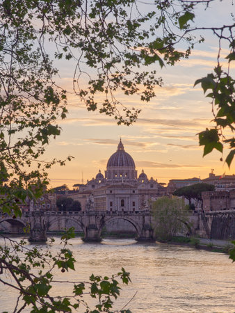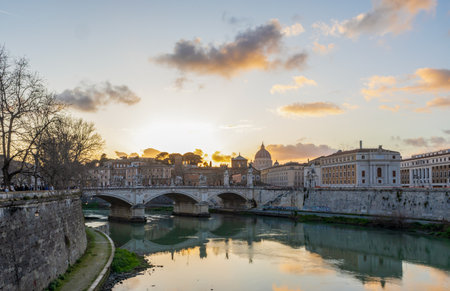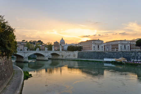 Rome, Italy - scenic view of river Tiber at sunset, on background St. Peter's Basilica dome