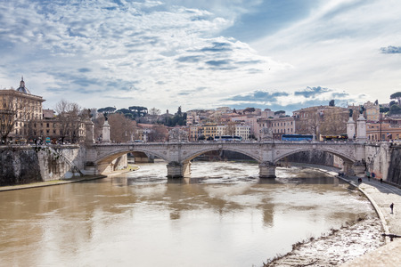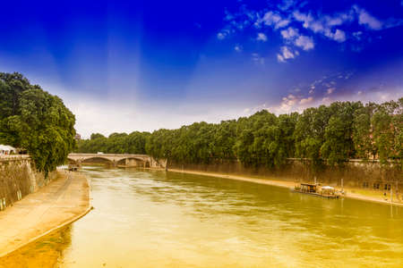 River Tiber and Bridge in a historic City, Rome, Italy. Sunny and Cloudy day.