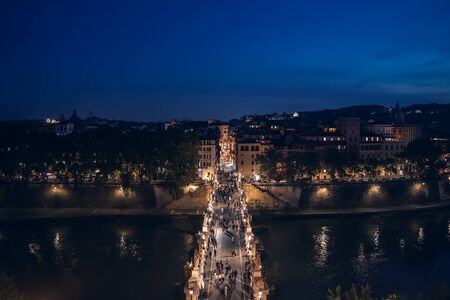 Bridge to Castle of Holy Angel with people at night in Rome historic centre, view from above.