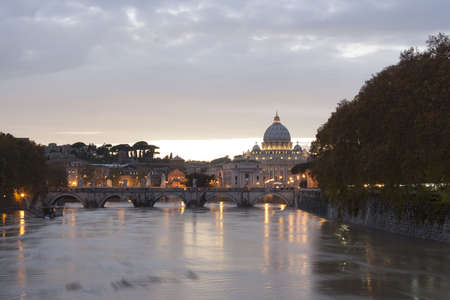 River Tiber in Rome with Vatican City St Peters Basilica and Ponte Vittorio Emanuele II at night