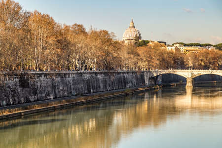 Riverside in Fall with Vatican St Peter Basilica and old bridge crossing Tiber River in the city center of Rome, Italy.