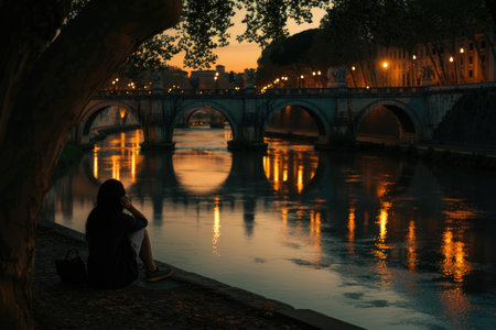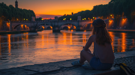 Back view of beautiful woman sitting at river reflect beautiful reflection of modern architectural building and enjoy looking at impressive view at modern bridge at sun set. Recreation concept. AIG42.