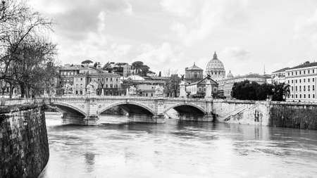 Black and white view of the bridge of Ponte Vittorio Emanuele II and saint Peter basilica over the Tiber river in Rome, Italy, Europe.