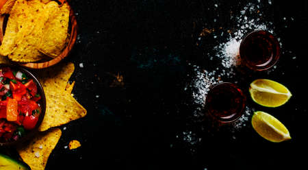 Mexican Food, Nachos, Guacamole, Salsa Sauce and Tequila, Food Background, Top View