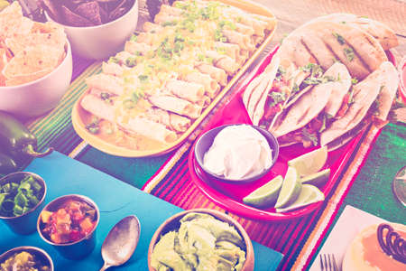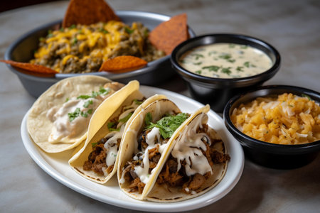 Traditional Mexican food mix with traditional spicy meal. Tacos with homemade salsa