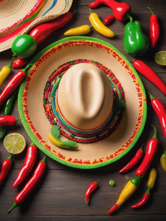 A straw sombrero hat is placed on a wooden table with red chili peppers, lime slices, and a potted cactus nearby.