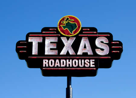 RIVER FALLS,WISCONSIN-SEPTEMBER 25,2014: Texas Roadhouse restaurant sign against a blue sky. Texas Roadhouse Corporation is headquartered in Louisville,Kentucky.
