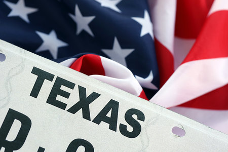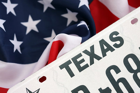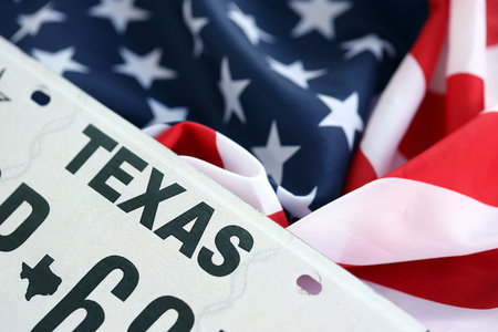 USA state of Texas license plate on US flag. Concept of driving in Texas. Reaching a driving permit