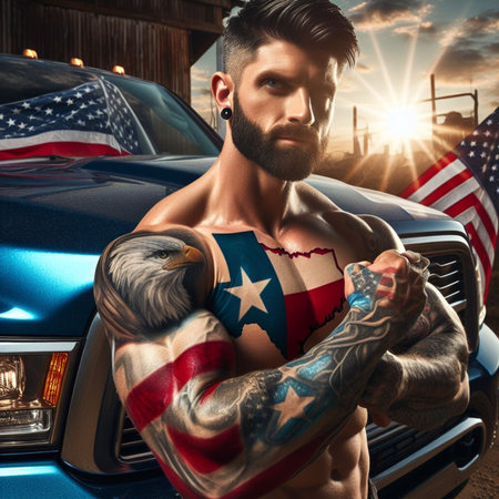 Muscular young white man with tattoos and an eagle on his shoulder, embodying a patriotic theme, celebrating 4th July independence day with american spirit card, AI generated