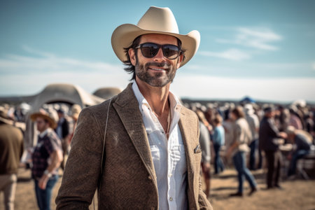 Portrait of a handsome man wearing a cowboy hat and sunglasses at a music festival