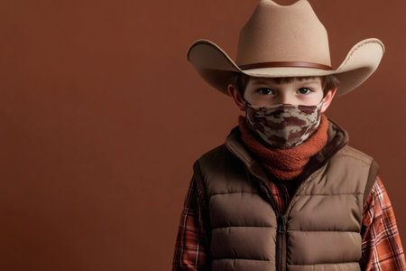 Portrait of a young cowboy wearing a camouflage mask, a brown hat and a padded vest, evoking themes of the Wild West and pandemic protection