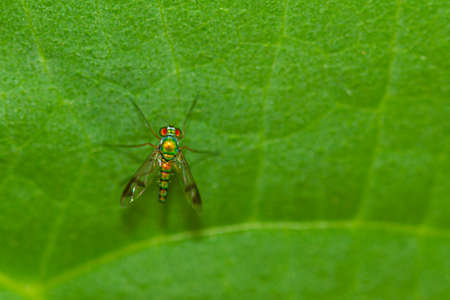 close up Dolichopodidae on green leaf