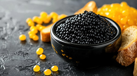 An elegant display of black caviar in a shiny bowl, accompanied by vibrant yellow salmon roe and rustic bread, showcasing gourmet food artistry.