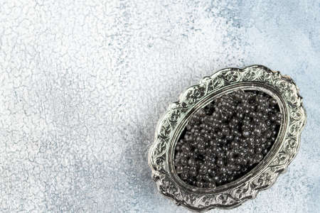 Black caviar served on the table. Exquisite delicacy of black sturgeon caviar.