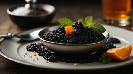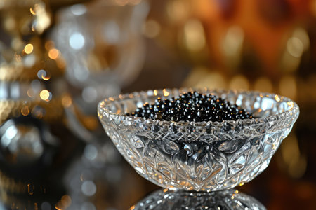A glass bowl filled with black beads sits on top of a table, Persian caviar served in a crystal bowl, AI Generated