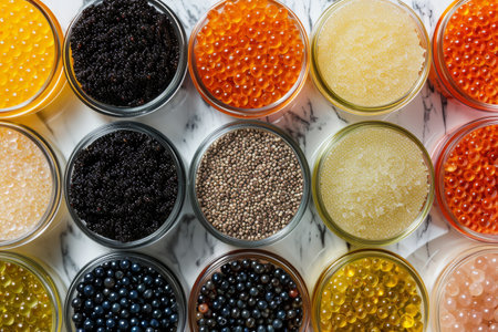 Assorted Colored Beads in a Jar, A variety of different caviar types, each with their distinct color and size, displayed side by side for comparison, AI Generated