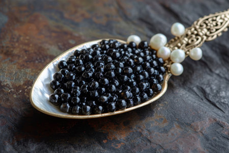 A white and black beaded necklace adorned with elegant pearls, Pearls of Iranian Beluga Caviar on a mother of pearl spoon, AI Generated