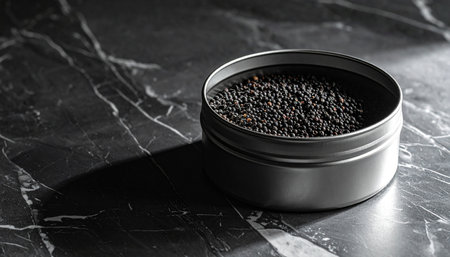 Black Caviar jar, on black wooden table background, top view flat lay with copy space for text
