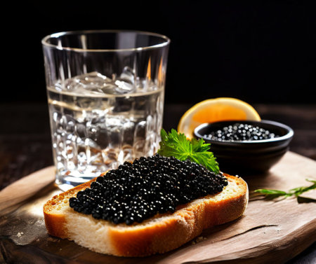 Vodka in a glass and a sandwich with caviar on a wooden table