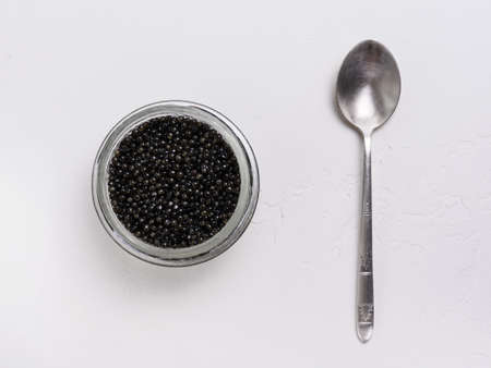 natural grainy black caviar in a glass jar and a spoon on a white background close-up